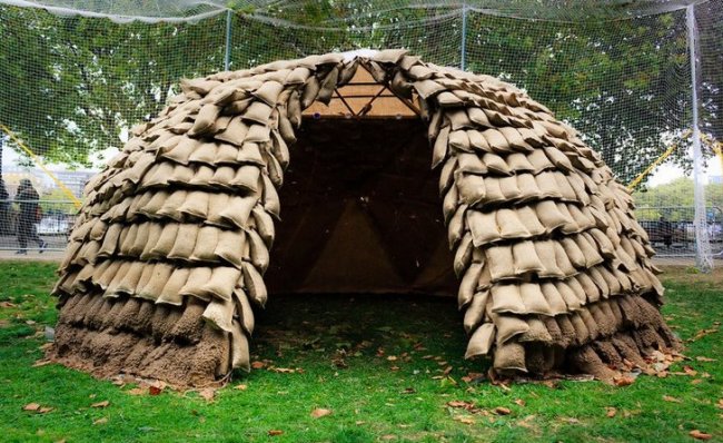 Идея состоит в том, чтобы мультикоптер с помощью распылительного шланга наносил слой глинистого биоматериала на легкий каркас, увешанный сотнями маленьких мешков с песком или опилками. Сам каркас выполняется в виде купола – подобная форма обусловлена способностью равномерно распределить вес мешков и грязевого покрытия на всю поверхность. Кроме того, такая конструкция здания обладает наибольшей энергоэффективностью.