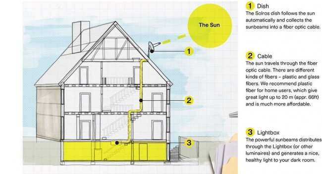 Но что делать, если у вас уже есть в распоряжении помещение, в котором нет окон? На помощь придет система, предложенная шведской компанией Solros. Она состоит из солнечного концентратора (зеркальной тарелки по типу спутниковой), который устанавливают на крыше или на ином открытом пространстве, пластикового оптоволоконного кабеля (можно использовать и стеклянный, но он существенно дороже), передающего свет на расстояние до 20 метров, чего обычно достаточно для разводки внутри дома, и лайтбоксов, освещающих комнаты мягким естественным светом.