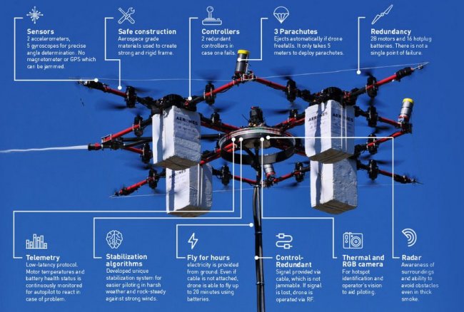 Мультикоптер передвигается с помощью 28 небольших моторов и оснащен 16 аккумуляторными батареями. При этом вокруг турбины дрон движется, будучи подключенным с помощью кабеля к источнику питания на земле. В автономном режиме беспилотник может находится в воздухе при исполнении своих обязанностей до 20 минут. Максимальная высота его полета – 400 метров, а на высоту 100 метров он поднимается всего за 2 секунды.