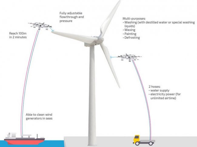В системе управления БПЛА заложены три базовые техники обслуживания ветрогенератора, которые определяют траекторию его полета и режим использования воды. При этом, система использования воды весьма эффективна, и автоматически настраивается в зависимости от типа и объема загрязнений.