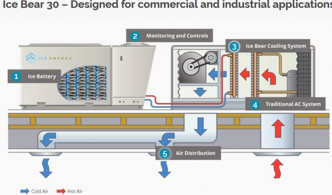Ice Energy известна своей коммерческой и промышленной технологией Ice Bear, использующей обычные системы кондиционирования, которые замораживают воду в непиковые периоды или, когда имеется избыточная солнечная или энергия ветра, и задействуют «ледяную батарею» в момент наибольшего спроса на энергию (охлаждение домов) во время пиковых периодов.