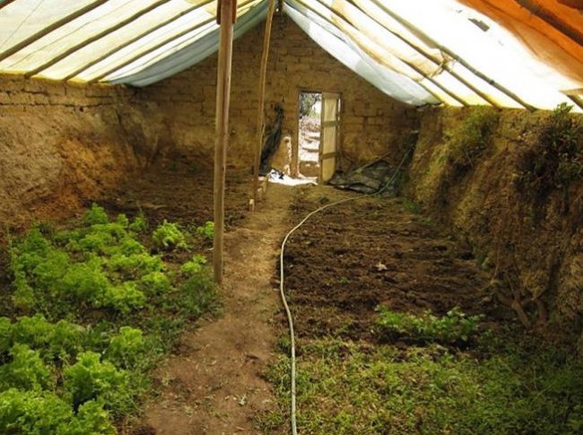 Толстая стена из спрессованной земли в задней части здания и более низкая фронтальная стена обеспечивают необходимый угол для кровли. Крыша герметизирует яму, создает изолирующее воздушное пространство между двумя слоями пленки (один лист сверху, а другой в нижней части крыши) и позволяет солнечным лучам проникать внутрь, создавая теплые, стабильные условия для роста растений.