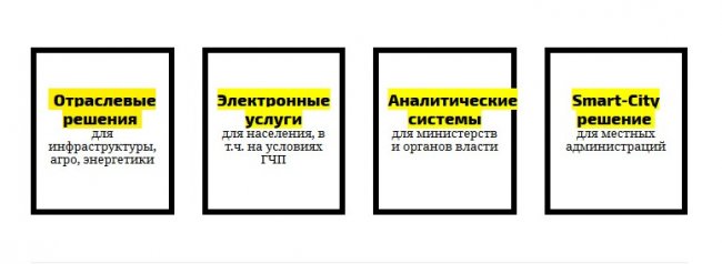 Электронные сервисы для агросектора, энергетики и инфраструктуры; Электронные государственные услуги на основе государственных реестров; Аналитические системы для министерств, обладминистраций и мэрий.