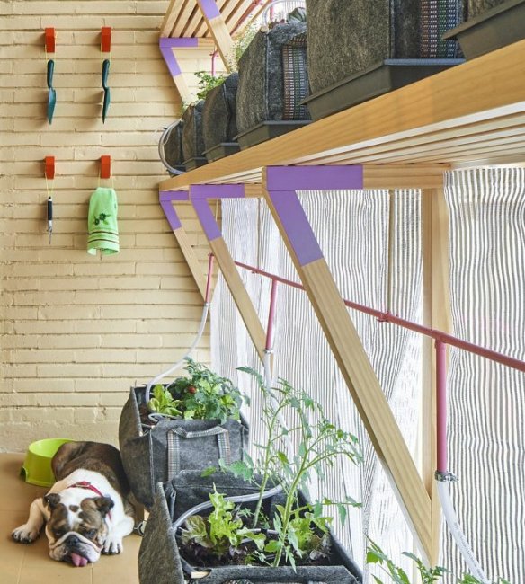 Вся западная — наиболее солнечная — стена квартиры заставлена стеллажами с насаждениями: цветы, овощи, свежая зелень к столу. Растения получают максимум света и создают тень, помогая избежать перегрева в самые жаркие дневные часы. Это пассивная система охлаждения и одновременно насыщения воздуха кислородом, с поглощением углекислого газа.