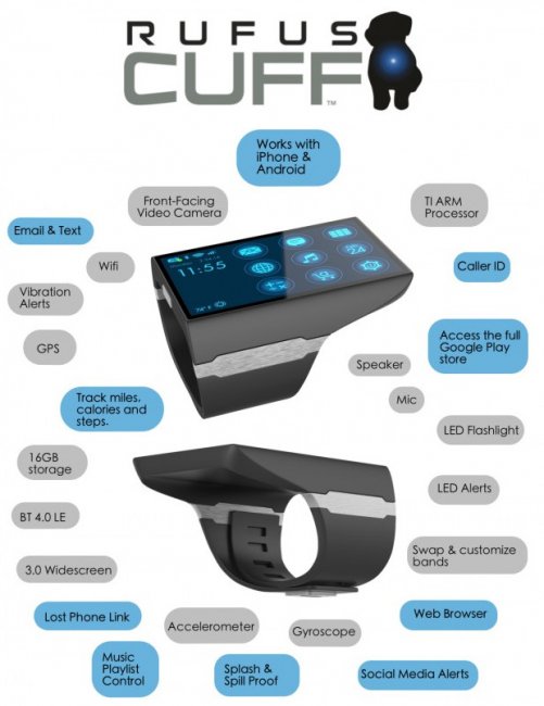 На площадке по коллективному сбору средств Indiegogo был запущен проект смарт-часов под названием Rufus Cuff. Их можно назвать полноценным коммуникатором, который отличается от других «умных» часов расширенным функционалом.